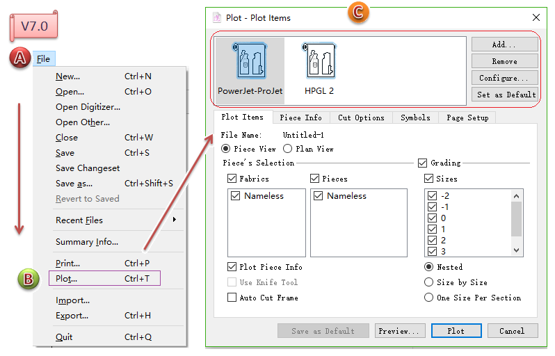 The plot setting page is moved to path File-Plot. Users can set the plot information and choose to send the file to plot on the same page.