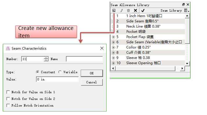 Users can creat more allowance values in the library as needed. Each library can include at most 999 allowance evolutions. Through the window of Seam Allowance Library, users can check each seam allowance’s number and name. Left-click the little cross-like symbol in front of the number and it shows the detailed information of the seam allowance evolution, like type, value and so on.