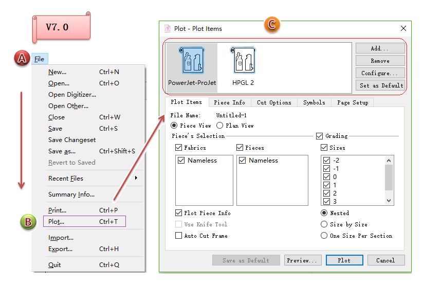 The plot setting page is moved to path File-Plot. Users can set the plot information and choose to send the file to plot on the same page.