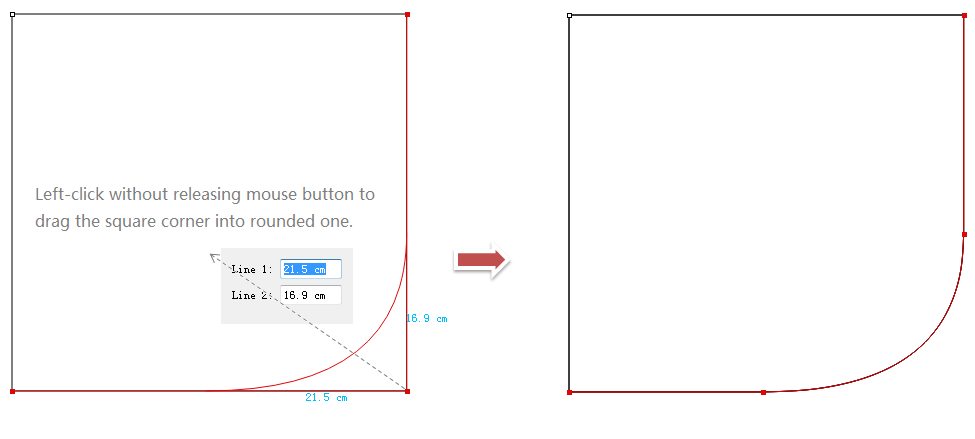 Left-click to drag the angle point upwards to make rounded corner, during this process, the values are shown. Allow users to enter desired