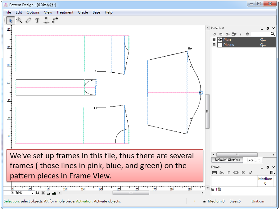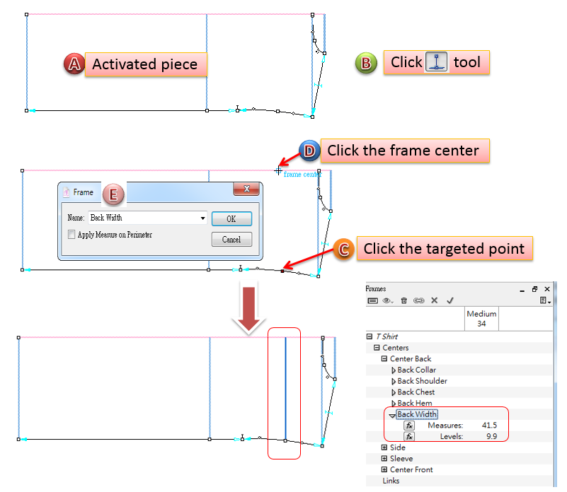 MTM เฟรม เป็นเส้นกำหนดเฉพาะ (เช่น ความกว้างคอด้านหน้าและด้านหลัง, ความกว้างไหล่, ความกว้างด้านหลัง, รอบอก, ชายเสื้อ, สะโพก…) และเซ็กเมนท์ต่างๆ (ขอบเสื้อผู้หญิงส่วนอก, เส้นโค้งของแขนเสื้อ, เส้นโค้งของช่องแขน…) เพื่อให้ผู้ใช้กำหนดขนาดชิ้นงานแพทเทิร์นได้; ป้อนรายขนาดในหน้าต่างแถบด้านข้างของเฟรม ผู้ใช้สามารถเชื่อมโยงเซ็กเมนท์เฟรมและรายขนาดผ่านสูตรเฉพาะได้; หากเส้นเซ็กเมนท์เฟรมหรือรายขนาดมีการเปลี่ยนแปลง เซ็กเมนท์เฟรมที่เกี่ยวข้องหรือรายขนาดก็จะเปลี่ยนไปด้วย
