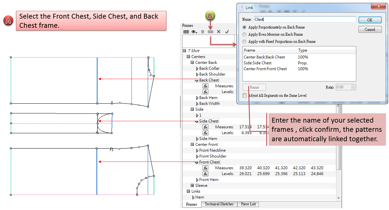 เชื่อมโยงเซ็กเมนท์ของเฟรมที่เกี่ยวข้องโดยใช้สูตร จะช่วยอำนวยความสะดวกในการปรับเปลี่ยนชิ้นงานแพทเทิร์นหรือขนาด หากขนาดเซ็กเมนท์ของเฟรมหนึ่งมีการเปลี่ยนแปลง ส่วนที่เชื่อมโยงก็จะเปลี่ยนไปด้วย