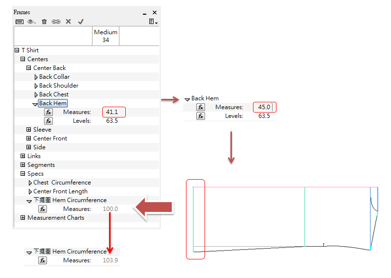 ตั้งค่ารายการขนาดที่ต้องการ และจะพบรายการเหล่านี้ได้ใน [Spec] ในหน้าต่างลอยของเฟรม รายการขนาดสามารถคำนวณจากรายการเซ็กเมนท์ของเฟรม/รายการขนาดอื่นๆได้ โดยใช้สูตรเฉพาะ หรือผู้ใช้สามารถป้อนค่าขนาดที่ต้องการได้ ฟังก์ชันนี้จะรวบรวมผลลัพธ์ของเฟรมเข้าด้วยกัน เพื่อสร้างแผ่นข้อมูลจำเพาะเกี่ยวกับเสื้อผ้าเพื่อวัตถุประสงค์ในการควบคุมคุณภาพ; นอกจากนี้ยังใช้กับสูตรของรายการที่เกี่ยวข้องได้ (Centers; Links; Segments) เมื่อผู้ใช้มีการเปลี่ยนแปลงขนาดข้อมูลจำเพาะ รายการที่เกี่ยวข้องก็จะเปลี่ยนไปด้วย