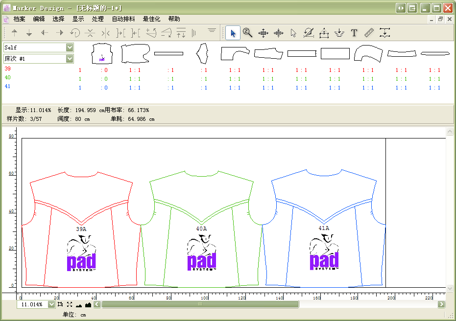 如上圖所示, PAD System™ 排料設計軟件工作界面包含: 菜單欄, 工具欄, 圖表區, 信息欄, 暫放區, 排料模擬區, 標尺, 右下角信息顯示(游標當前座標, 當前繪製單位), 每個部分及其功能在後面將詳盡闡明.