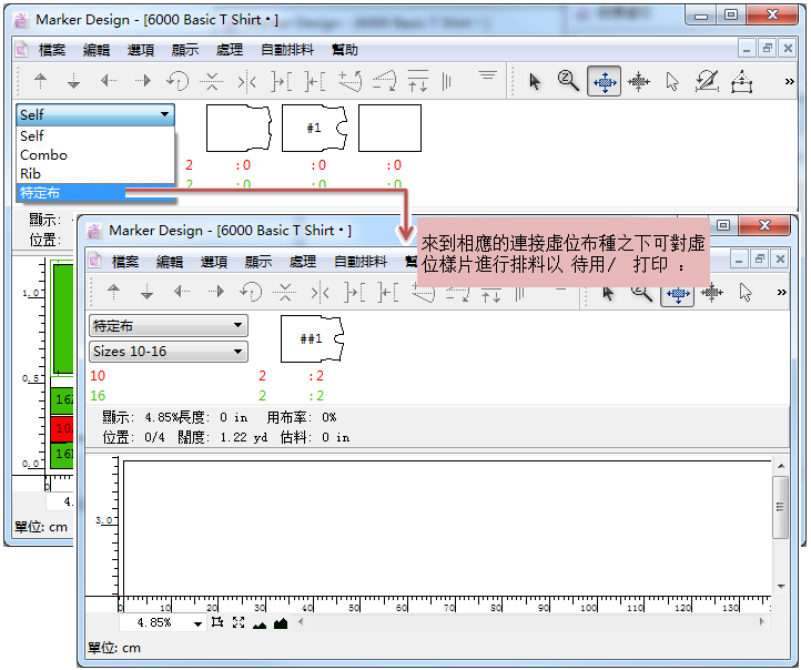 則此兩樣片之合併適用於全部尺碼, 將圖表區合併好的樣片取下排料區, 您會發相應樣片的全部尺碼均按照前面的合併設置合併好了