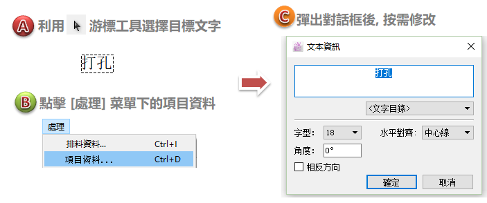 文字¶利用此工具, 用戶可在暫放區或排料模擬區中添加文字, 或修改現有的文字資料.