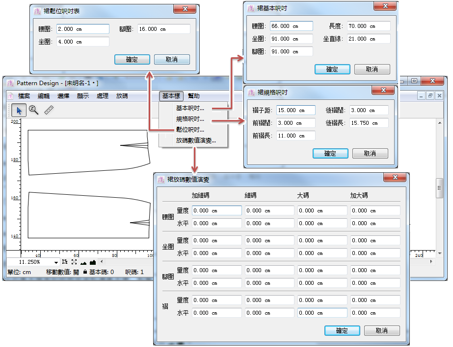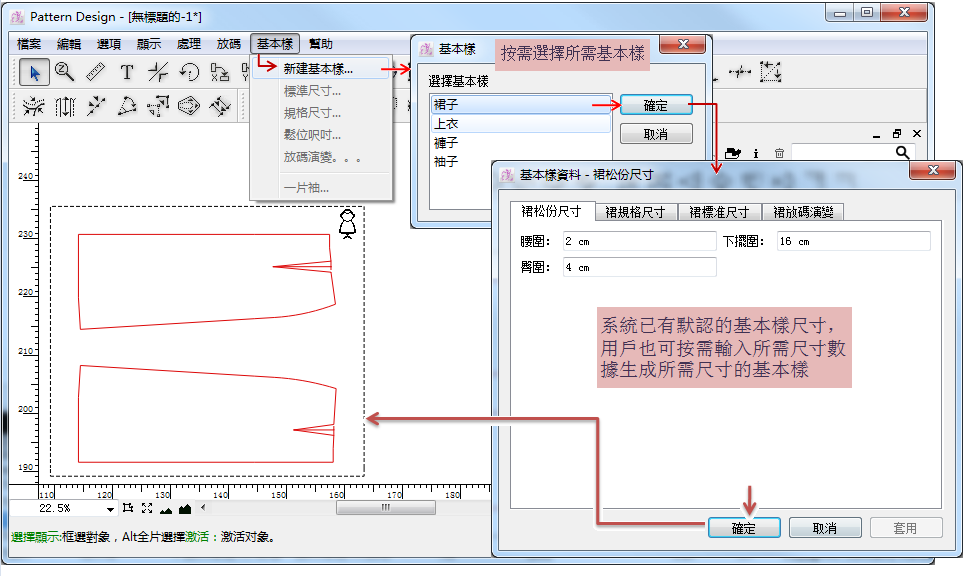 出現基本樣資料對話框, 系統已有默認的基本樣尺寸, 用戶也可按需輸入所需尺寸數據生成所需尺寸的基本樣; 點擊 [確定] 按鈕, 即在工作區域生成所需的基本樣