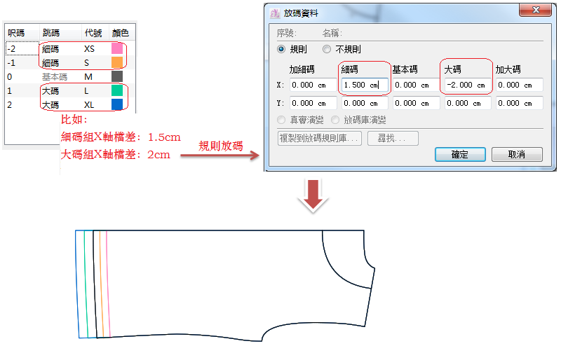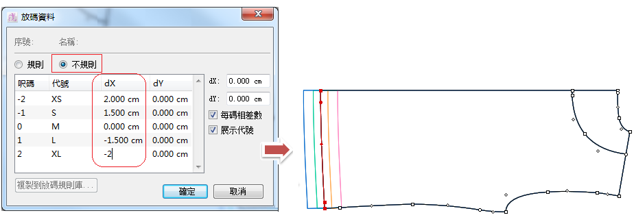 建立好放碼規則庫後, 用戶可在製作紙樣中直接使用放碼規則庫中的數據進行放碼, 提高用戶打版效率.