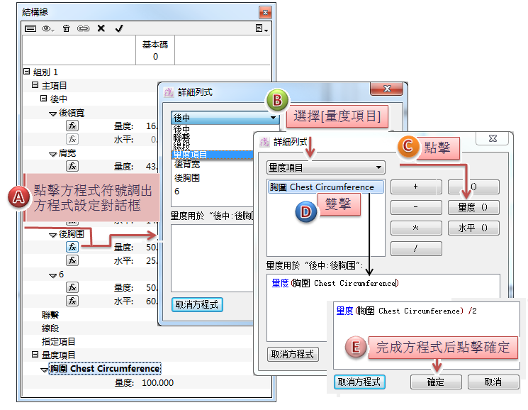 將第1步設定輸入的尺寸 “胸圍” , 應用于相應的項目的方程式上: