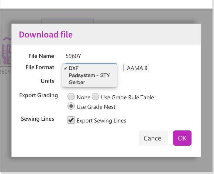 For pattern works, you can upload STY, DXF, DXF with RUL, ZIP (for Gerber only), and download STY, DXF, DXF with RUL, ZIP (for Gerber only) file formats.